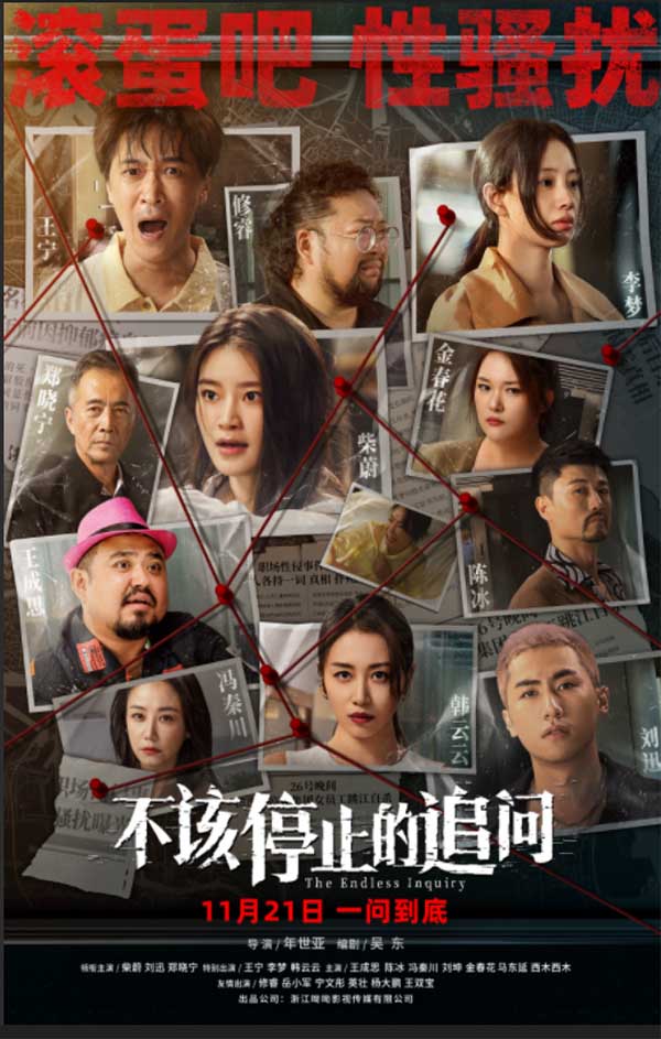 由年世亚导演,吴东编剧,柴蔚、刘迅、郑晓宁领衔主演,王宁、李梦特别出演的反性骚扰电影《不该停止的追问》自宣布定档11月21日以来,就引发了诸多好评——“影片真敢拍”、“反性骚扰的电影现实意义重大”、“三观极正,值得期待”等不绝于耳,引发网友热议。近日,影片又发布了“全员入局”版海报, 11个角色悉数登场,充满疑云的性骚扰恶行背后,真相更加扑朔迷离,令人充满好奇。影片讲述了王菁菁(柴蔚饰)为找出姐姐王遥(李梦饰)撇下幼女离奇自杀的真相,勇敢揭开知名企业隐秘和幕后黑手的故事。在此过程中,菁菁发现了与姐姐命案关联最紧密的性骚扰恶行,在多方压力和拦阻下,她将如何绝地反击,用智慧和勇气迎来反杀?影片立足现实并传递了希望,其中精彩的追查真相过程和对性骚扰恶行的揭露,给人带来新奇的观影感受,进一步提升了观众的观看欲望。