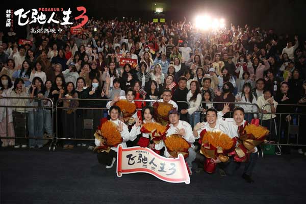 大年初二,编剧兼导演韩寒,演员沈腾、尹正、魏翔、沙溢、张新成现身电影《飞驰人生3》沈阳路演活动。当地观众兴奋分享观影感受,纷纷对张驰的辛酸和不易深感共情,更从他坚持梦想的行为中获得力量。有人将“飞驰人生”系列的台词金句写在衣服上鼓舞自己勇往直前;还有观众精心准备画作,以线条勾勒出张驰朝着梦想全速前进的人生轨迹;更有人将该系列选为自己的“人生电影”,感慨“无论在巴音布鲁克赛道上还是在人生的赛道上,只要坚持不放弃梦想和热爱,我们都能找到自己的飞驰人生”。