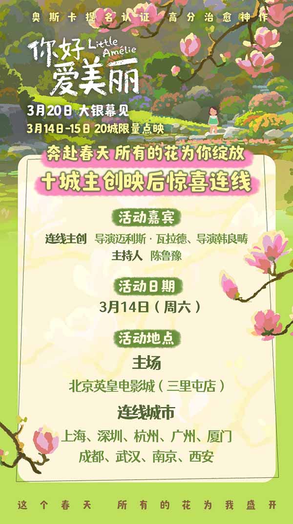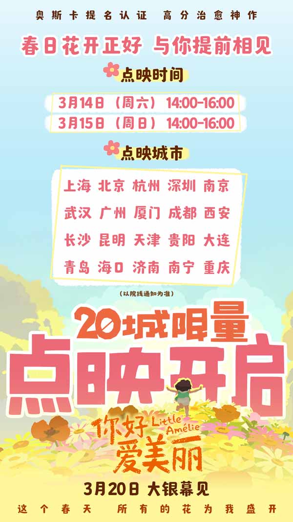 今日释出的“春日暖阳”海报中,爱美丽张开双臂平躺在大地上,沐浴阳光,眼里充满对于世界的好奇,和煦的春光也透露着影片温柔治愈的基调,令观众感受童真的纯粹与生命的美好。同步发布了导演迈利斯·瓦拉德、导演韩良畴给中国观众的独家问候视频,两位导演亲切地向内地观众问好,发出诚挚的观影邀约,映后隔空畅谈幕后创作趣事,一同度过一个惬意的春日午后。 3月14至3月15日,电影将在上海、北京、杭州、深圳、南京、武汉、广州、厦门、成都、西安、长沙、昆明、天津、贵阳、大连、青岛、海口、济南、南宁、重庆开启全国二十城限量点映,3月14日点映期间,北京、上海、深圳、杭州、广州、厦门、成都、武汉、南京、西安十城将举办映后连线活动,邀请知名主持人陈鲁豫与导演迈利斯·瓦拉德、导演韩良畴进行线上连线对谈。本周末走进影院享受一段温馨治愈的时光,与爱美丽一起迎接崭新春天吧!